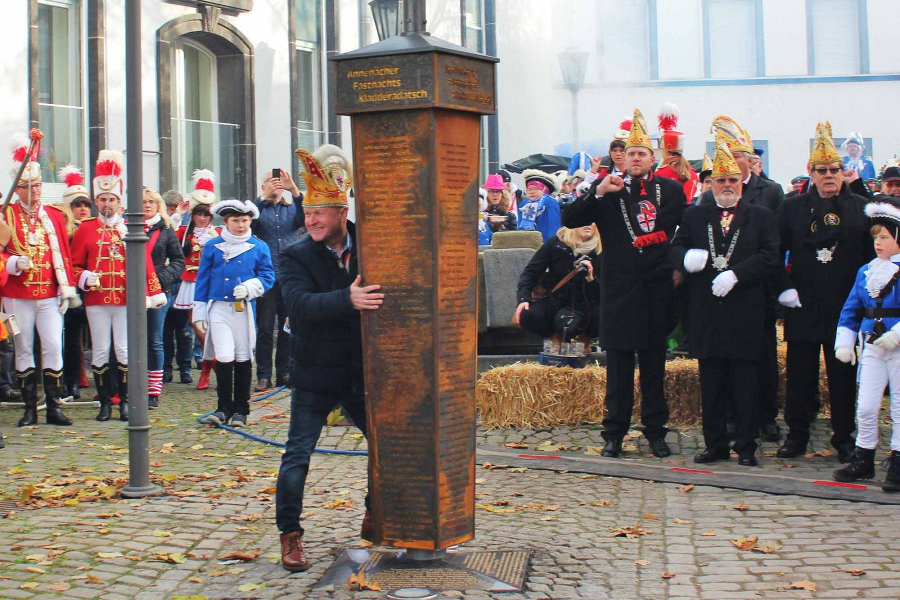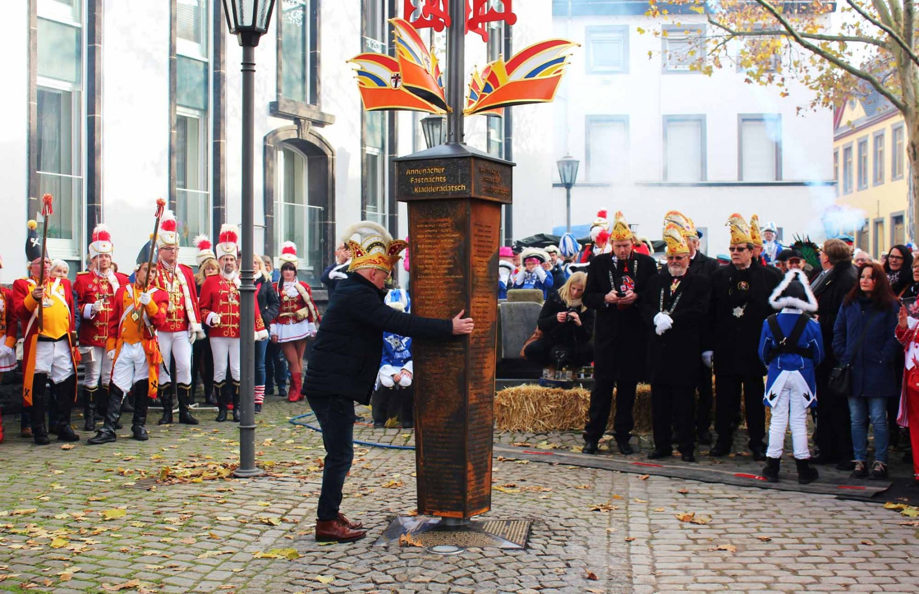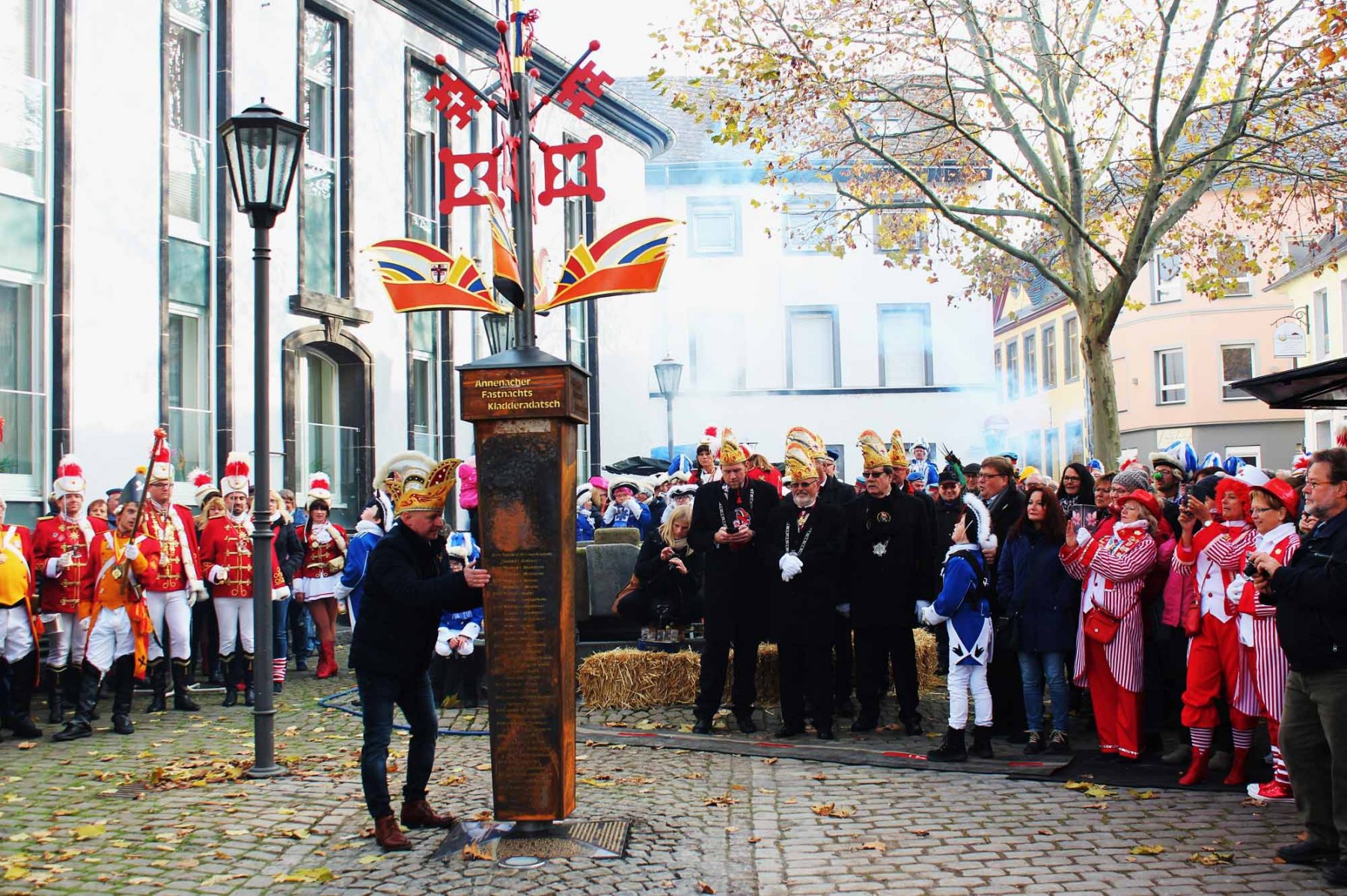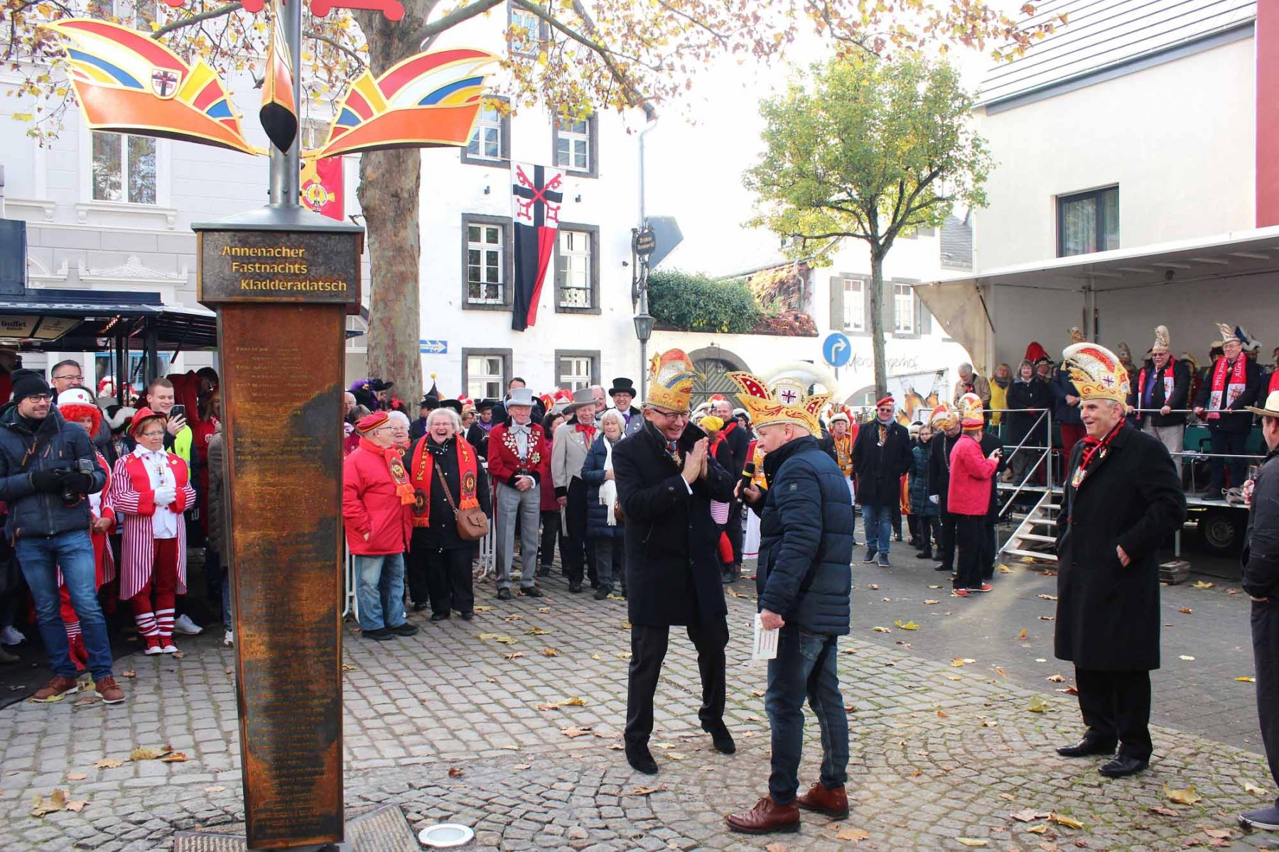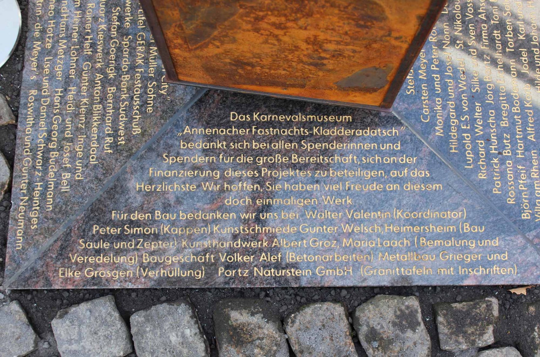 „Eine 4,20 Meter hohe, rostfarbene Metallsäule, in ihrem unteren Teil versehen mit Namensgravuren der rund 80 Tollitätenpaare, die von 1896 bis 2019 als närrische Regenten in die Karnevalshistorie der Bäckerjungenstadt einzogen. Sie bietet noch Platz für etwa 40 weitere Prinzenpaare. Die Prinzen-Säule trägt die Aufschrift „Andernacher Fastnachts-Kladderadatsch“. Ihren oberen Teil bildet ein Stahlrohr, das von vier mehrfarbigen Narrenkappen und großen roten Schlüsseln der Stadt geziert wird. Darauf als Spitze ein goldenes Prinzenzepter. Am Fuß des Brauchtums-Denkmals, das in der Dunkelheit durch Strahler beleuchtet werden kann, erfährt man die Namen der ausführenden Personen und Firmen. Auch die Spenderinnen und Spender werden genannt.“