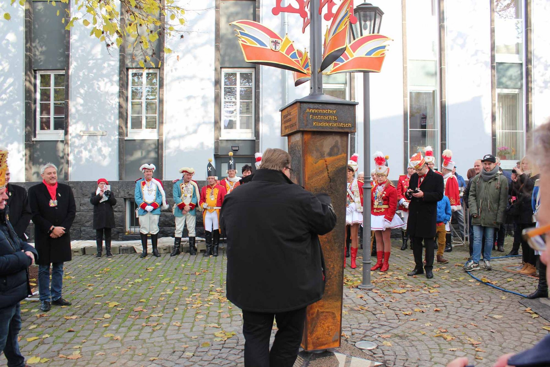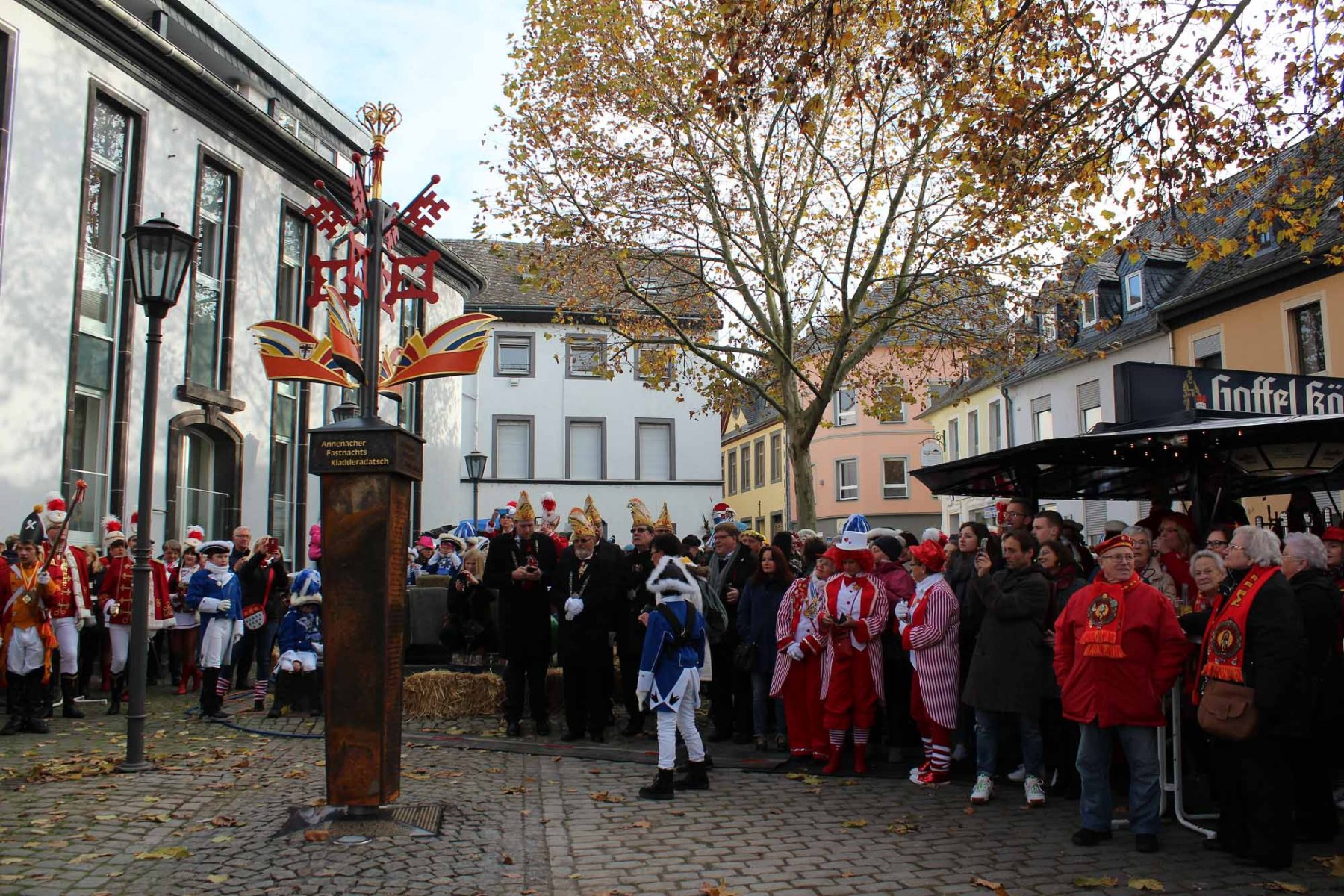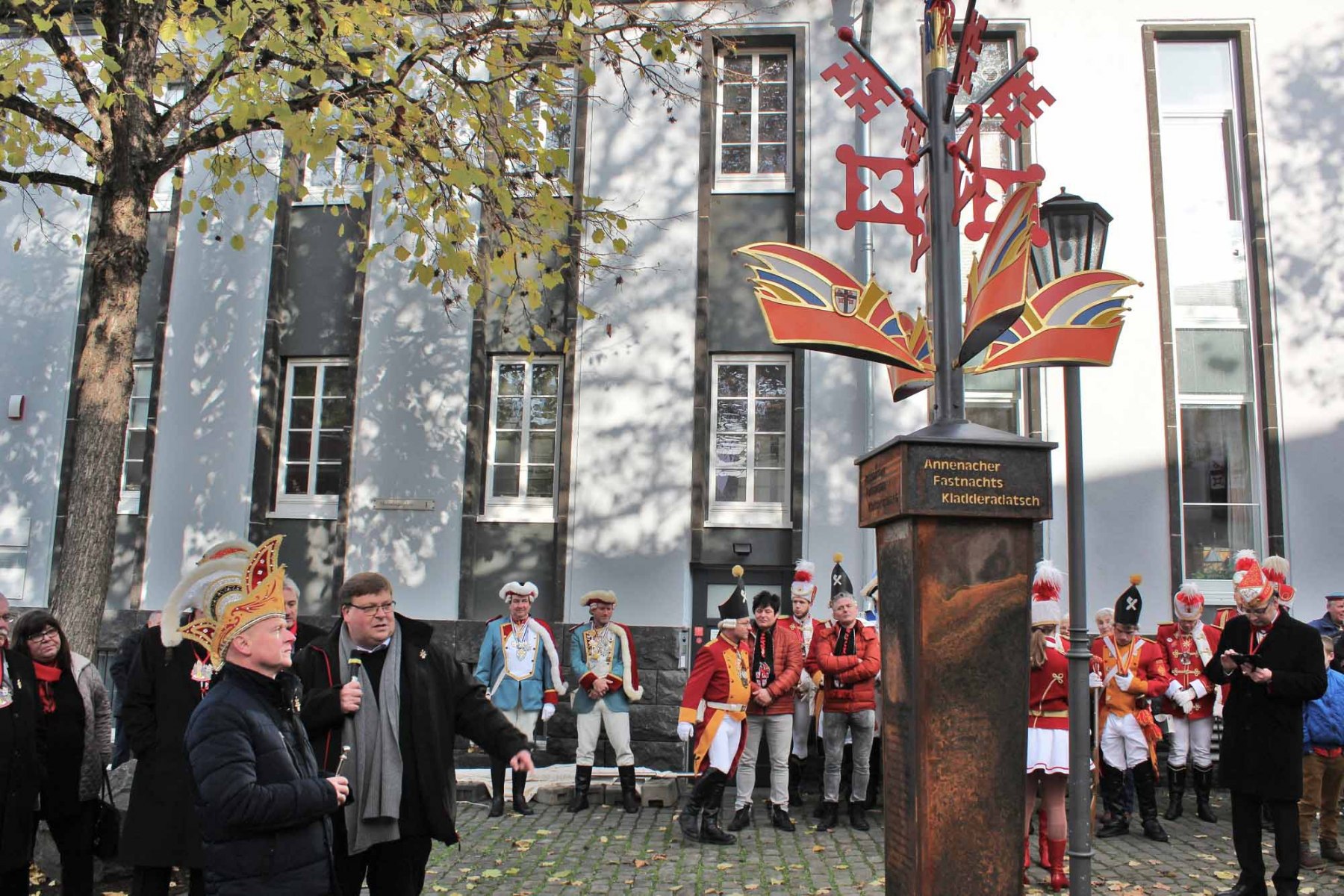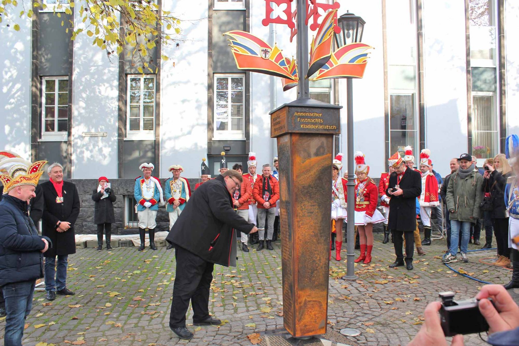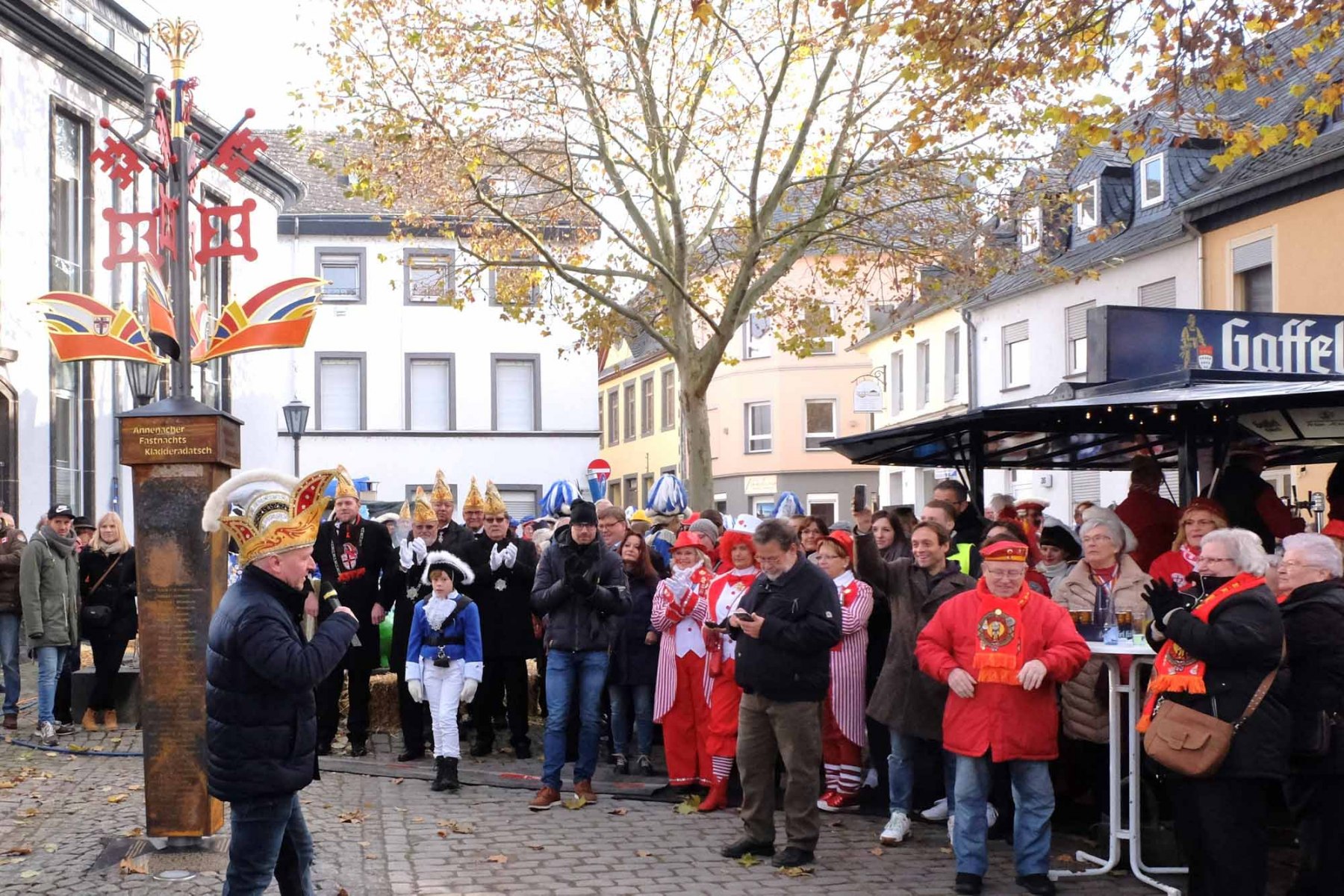 „Eine 4,20 Meter hohe, rostfarbene Metallsäule, in ihrem unteren Teil versehen mit Namensgravuren der rund 80 Tollitätenpaare, die von 1896 bis 2019 als närrische Regenten in die Karnevalshistorie der Bäckerjungenstadt einzogen. Sie bietet noch Platz für etwa 40 weitere Prinzenpaare. Die Prinzen-Säule trägt die Aufschrift „Andernacher Fastnachts-Kladderadatsch“. Ihren oberen Teil bildet ein Stahlrohr, das von vier mehrfarbigen Narrenkappen und großen roten Schlüsseln der Stadt geziert wird. Darauf als Spitze ein goldenes Prinzenzepter. Am Fuß des Brauchtums-Denkmals, das in der Dunkelheit durch Strahler beleuchtet werden kann, erfährt man die Namen der ausführenden Personen und Firmen. Auch die Spenderinnen und Spender werden genannt.“