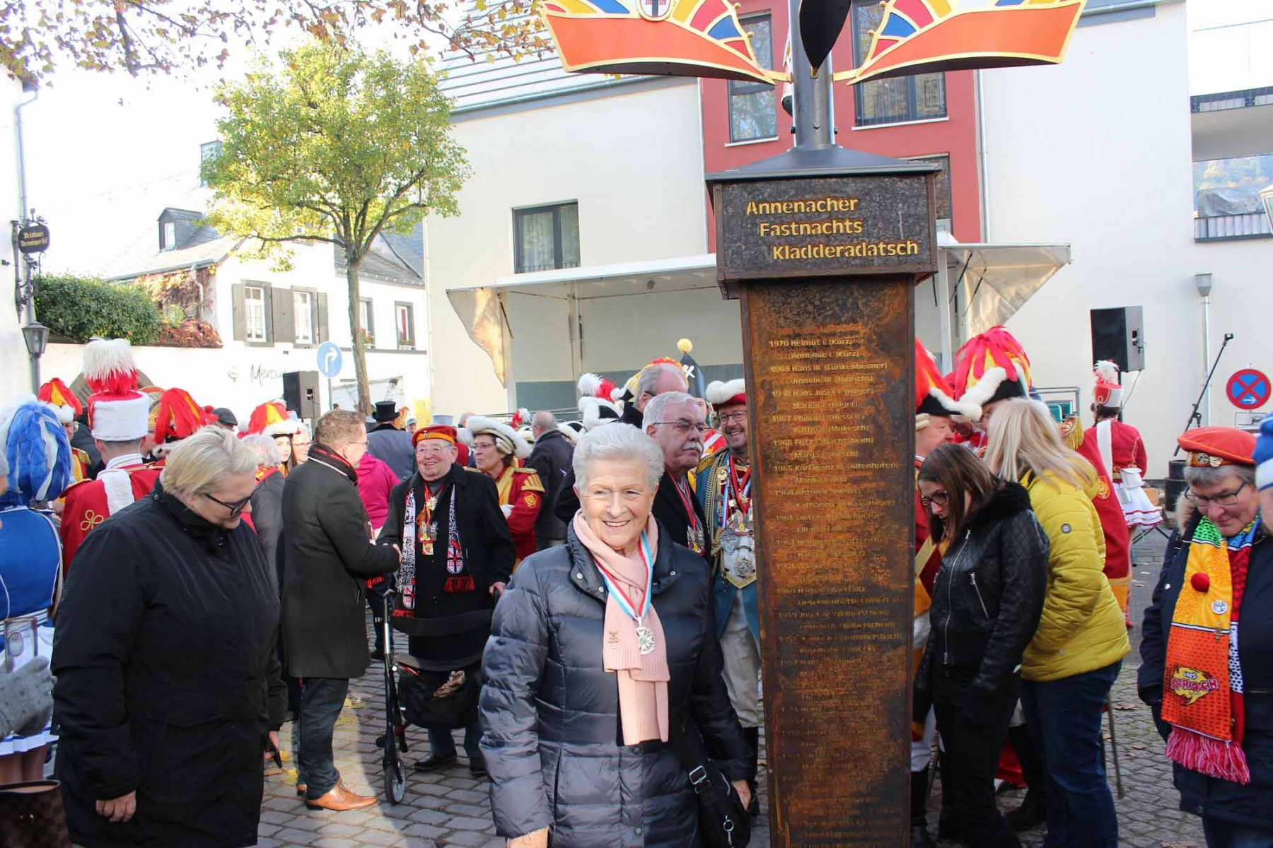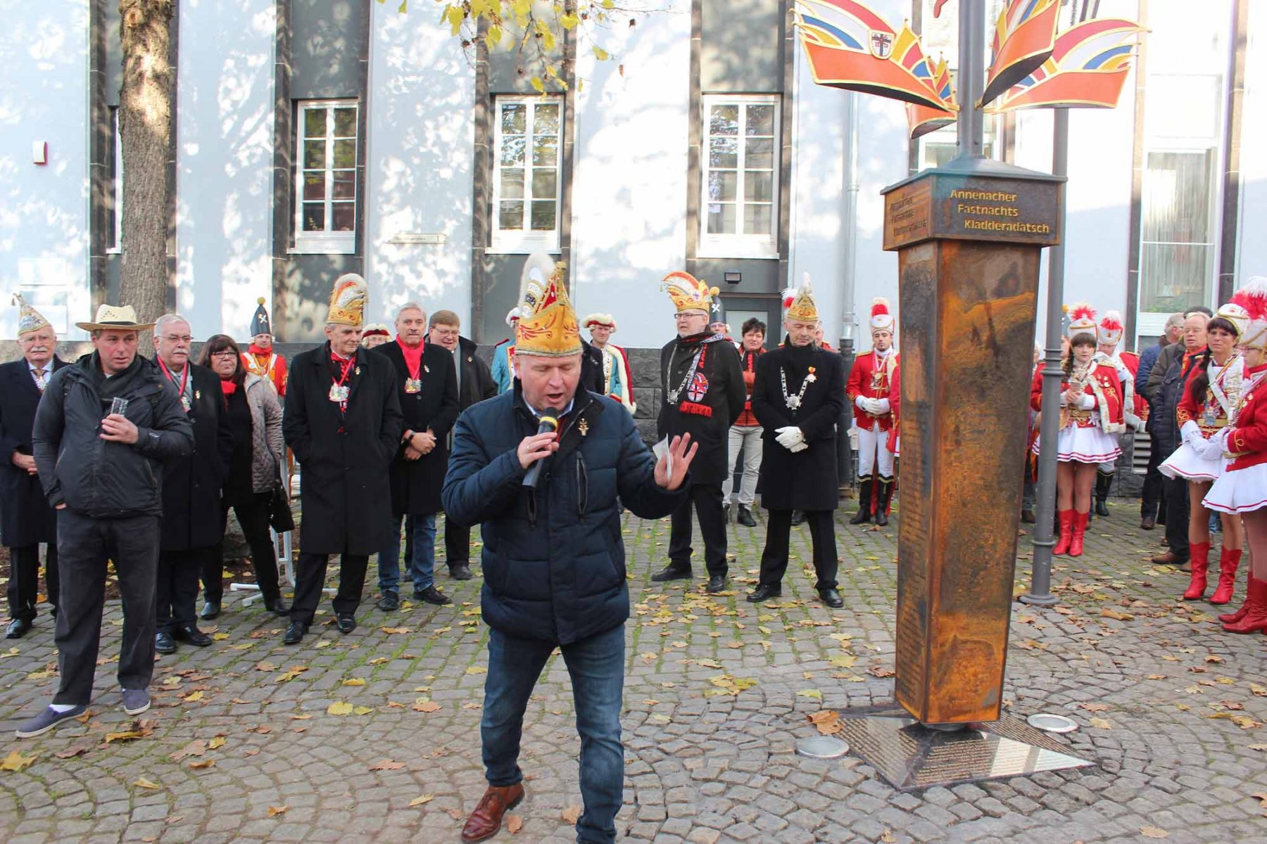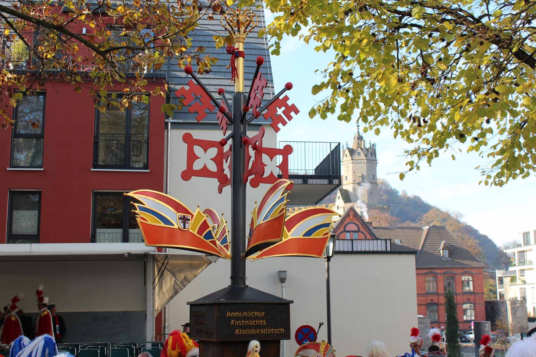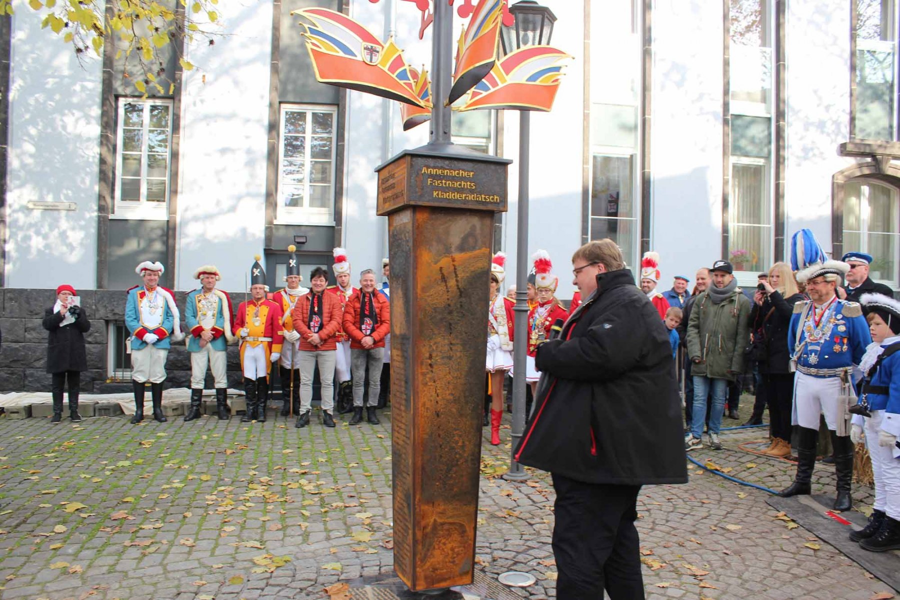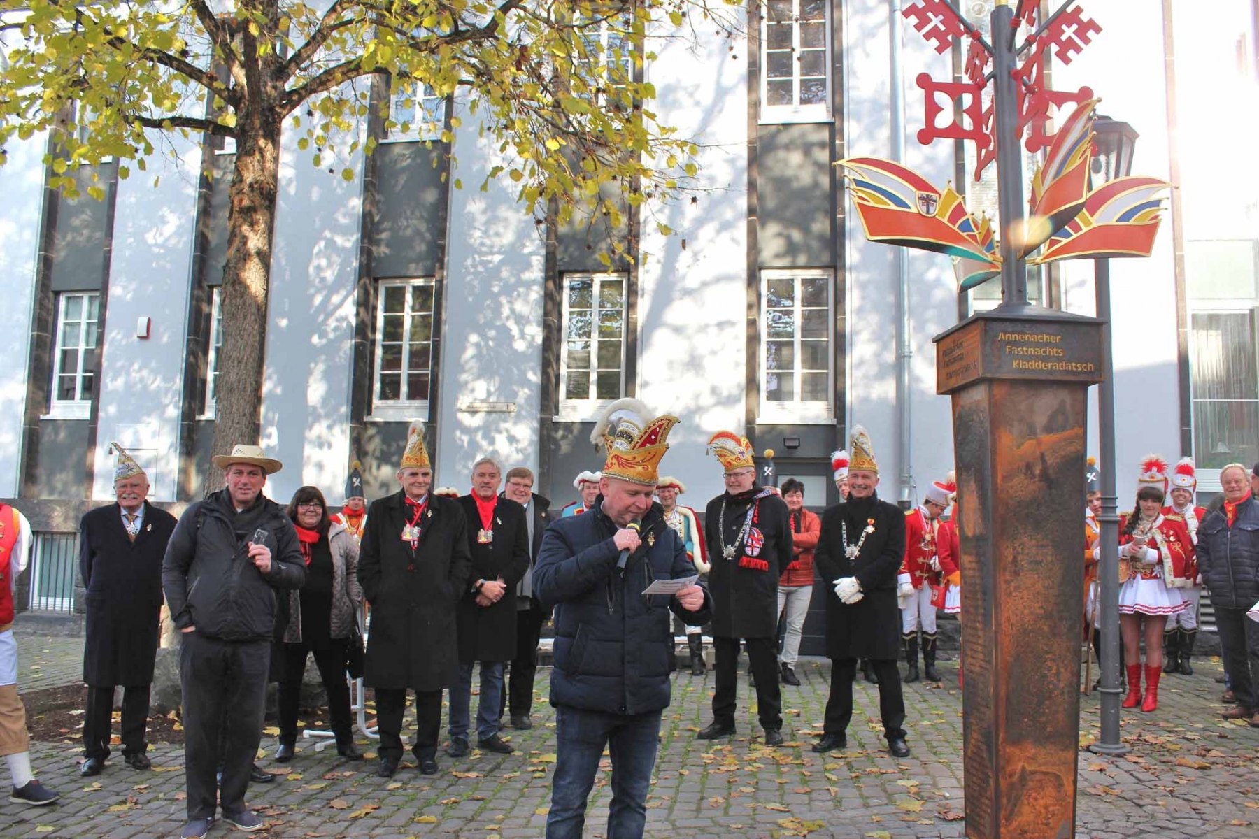 „Eine 4,20 Meter hohe, rostfarbene Metallsäule, in ihrem unteren Teil versehen mit Namensgravuren der rund 80 Tollitätenpaare, die von 1896 bis 2019 als närrische Regenten in die Karnevalshistorie der Bäckerjungenstadt einzogen. Sie bietet noch Platz für etwa 40 weitere Prinzenpaare. Die Prinzen-Säule trägt die Aufschrift „Andernacher Fastnachts-Kladderadatsch“. Ihren oberen Teil bildet ein Stahlrohr, das von vier mehrfarbigen Narrenkappen und großen roten Schlüsseln der Stadt geziert wird. Darauf als Spitze ein goldenes Prinzenzepter. Am Fuß des Brauchtums-Denkmals, das in der Dunkelheit durch Strahler beleuchtet werden kann, erfährt man die Namen der ausführenden Personen und Firmen. Auch die Spenderinnen und Spender werden genannt.“