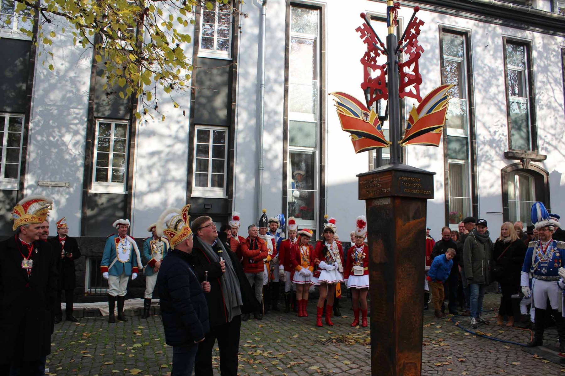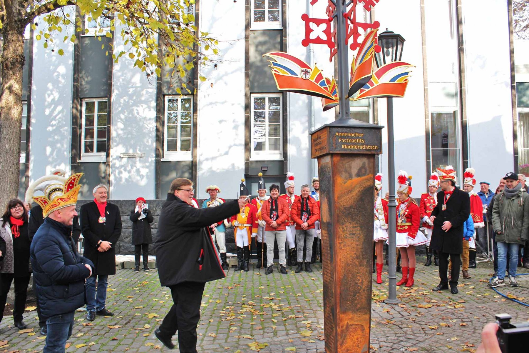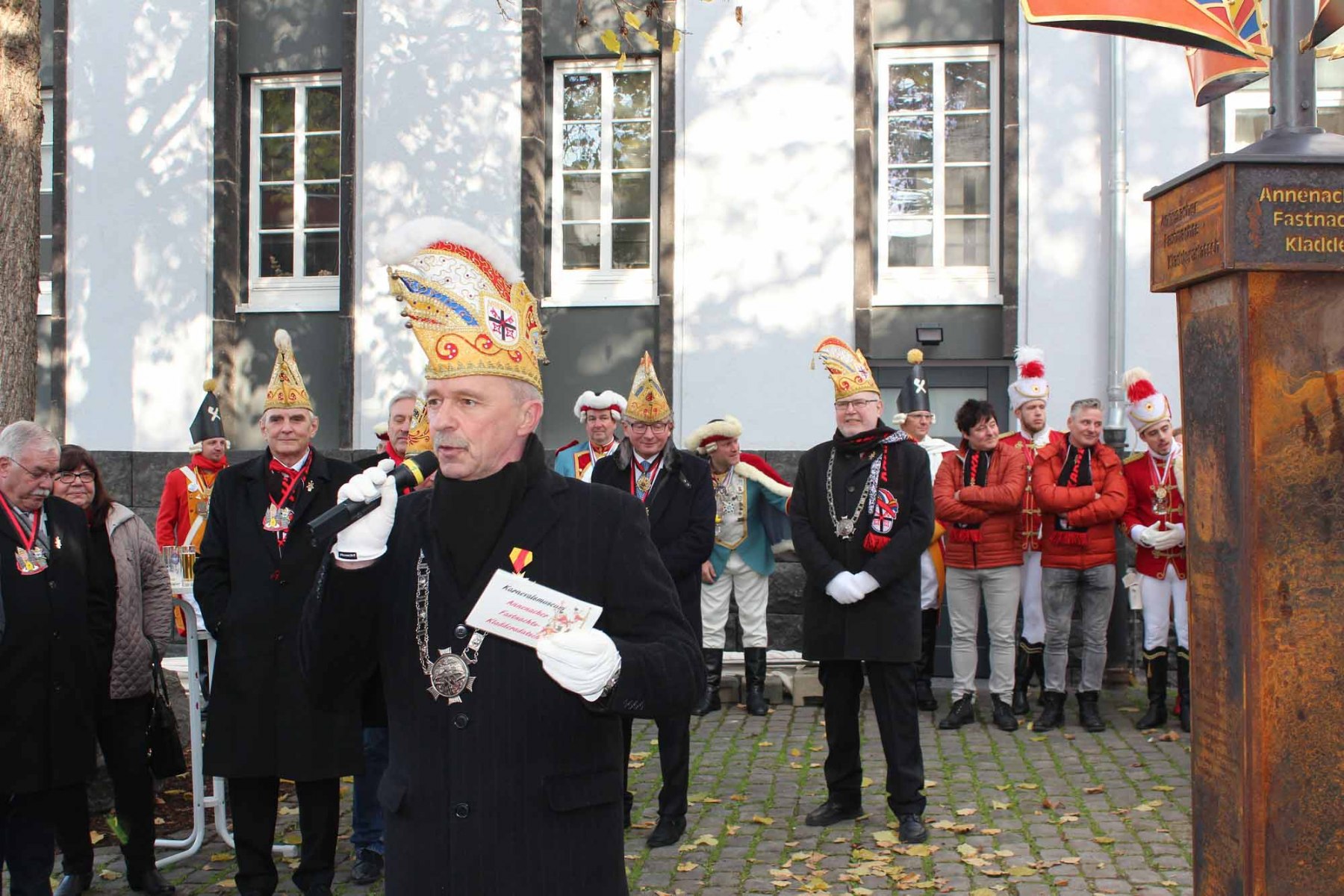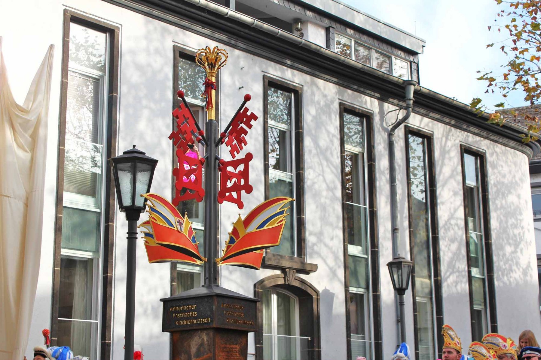„Eine 4,20 Meter hohe, rostfarbene Metallsäule, in ihrem unteren Teil versehen mit Namensgravuren der rund 80 Tollitätenpaare, die von 1896 bis 2019 als närrische Regenten in die Karnevalshistorie der Bäckerjungenstadt einzogen. Sie bietet noch Platz für etwa 40 weitere Prinzenpaare. Die Prinzen-Säule trägt die Aufschrift „Andernacher Fastnachts-Kladderadatsch“. Ihren oberen Teil bildet ein Stahlrohr, das von vier mehrfarbigen Narrenkappen und großen roten Schlüsseln der Stadt geziert wird. Darauf als Spitze ein goldenes Prinzenzepter. Am Fuß des Brauchtums-Denkmals, das in der Dunkelheit durch Strahler beleuchtet werden kann, erfährt man die Namen der ausführenden Personen und Firmen. Auch die Spenderinnen und Spender werden genannt.“