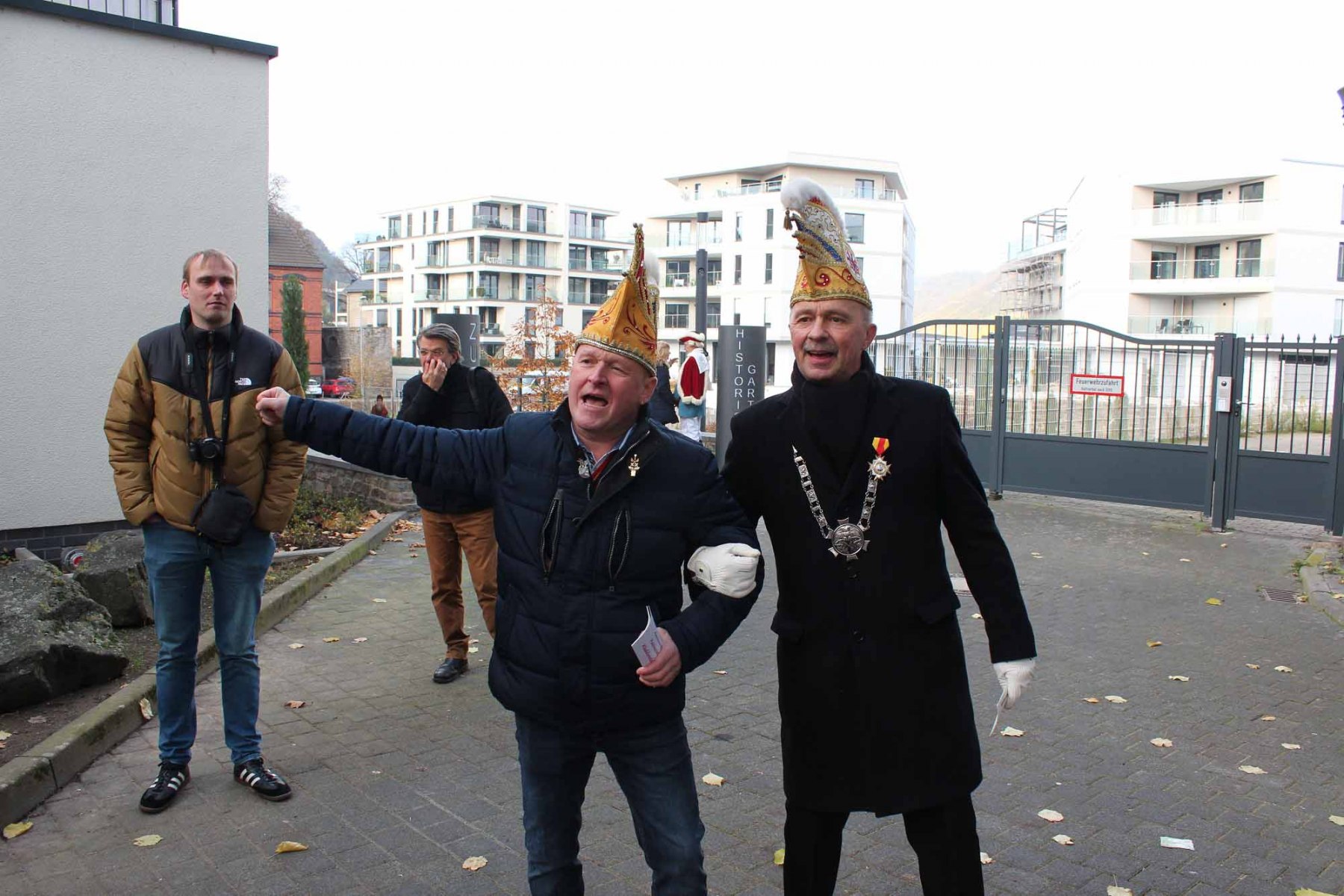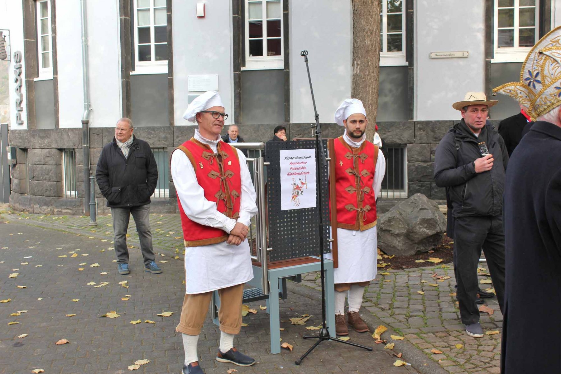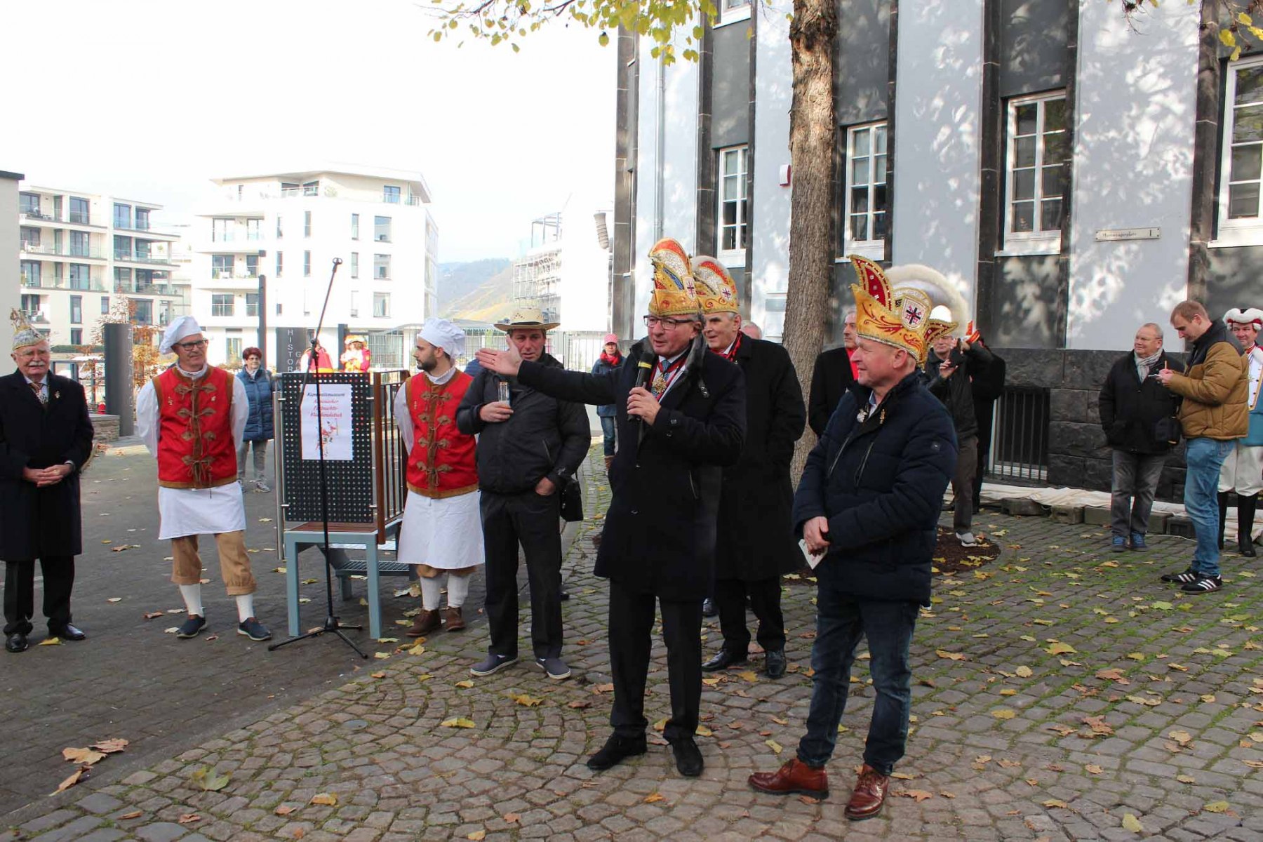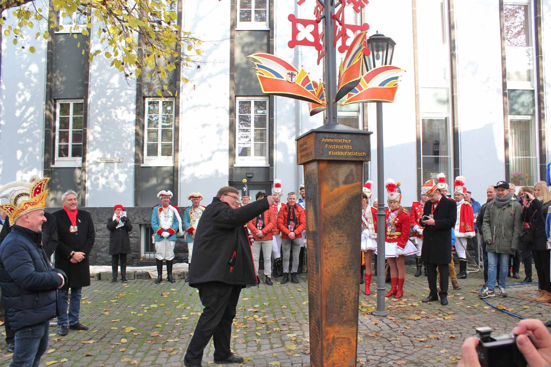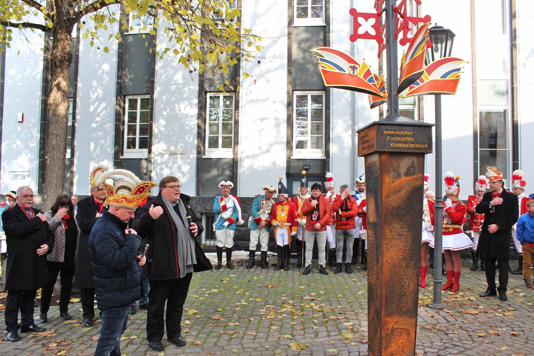 „Eine 4,20 Meter hohe, rostfarbene Metallsäule, in ihrem unteren Teil versehen mit Namensgravuren der rund 80 Tollitätenpaare, die von 1896 bis 2019 als närrische Regenten in die Karnevalshistorie der Bäckerjungenstadt einzogen. Sie bietet noch Platz für etwa 40 weitere Prinzenpaare. Die Prinzen-Säule trägt die Aufschrift „Andernacher Fastnachts-Kladderadatsch“. Ihren oberen Teil bildet ein Stahlrohr, das von vier mehrfarbigen Narrenkappen und großen roten Schlüsseln der Stadt geziert wird. Darauf als Spitze ein goldenes Prinzenzepter. Am Fuß des Brauchtums-Denkmals, das in der Dunkelheit durch Strahler beleuchtet werden kann, erfährt man die Namen der ausführenden Personen und Firmen. Auch die Spenderinnen und Spender werden genannt.“